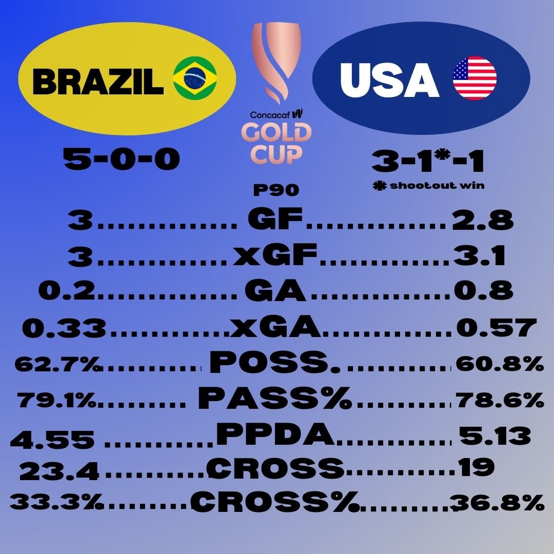 It seems that defensively speaking, Brazil has been notably better during the tourney. Not only have the Americans conceded four times as many goals, but their expected goals conceded is around double of the Selecao too.