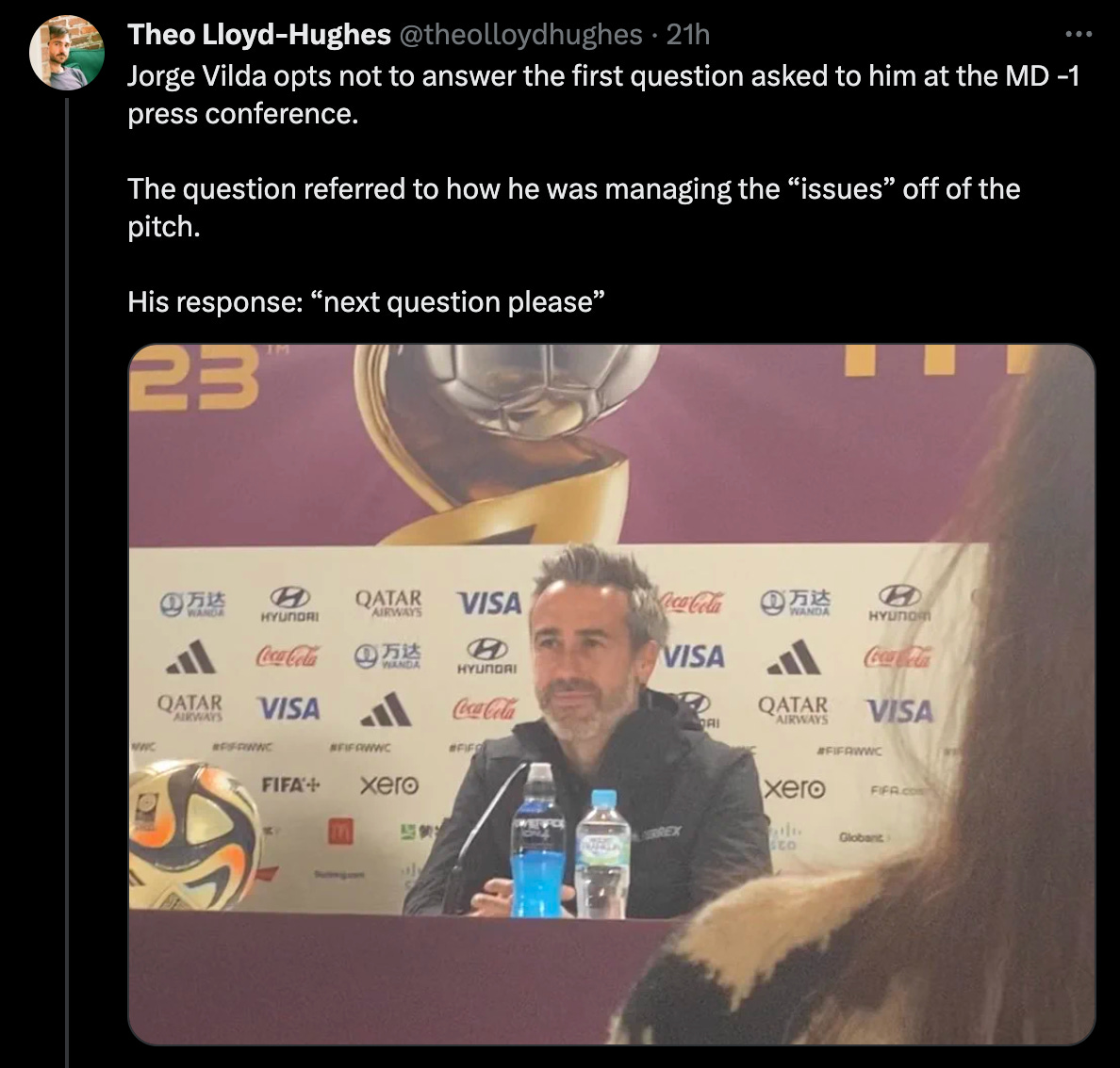 Moments later, Tom Garry of the Daily Telegraph probed Vilda about whether he would apologize to some of the world’s best footballers not being at the tournament based on the lack of accountability and trust issues in the Spanish football that led to three players choosing not to play at the World Cup.