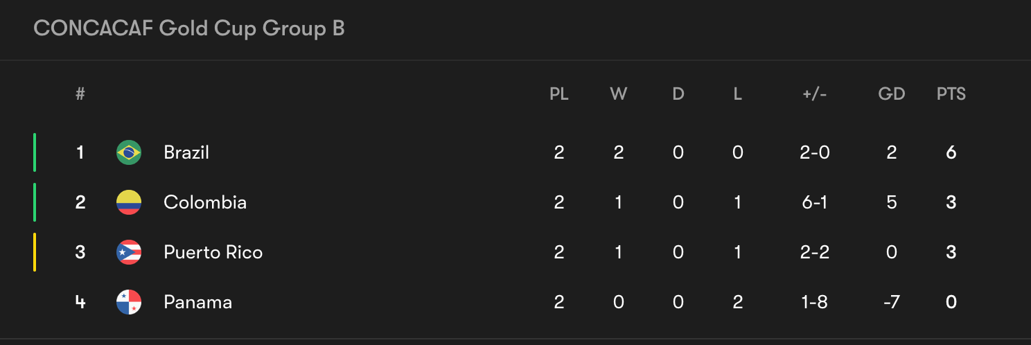 Panama finds itself in a similar position but the odds are slightly more in their favour. A big win over Brazil is needed, combined with a Puerto Rico defeat to Colombia, to swing a 7-goal margin. A 2-1 win over Brazil and a 6-0 defeat for Puerto Rico would decide third place on discipline.