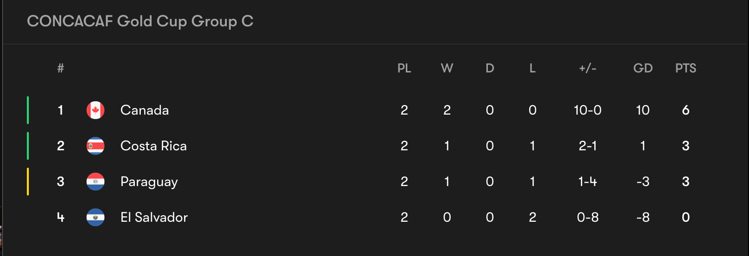 Just like DR and Panama, El Salvador is not eliminated yet but will need a big win over Paraguay to stand any chance of making the Quarterfinals. If Canada pummels Costa Rica, and lowers their goal difference enough, La Selecta could also jump Las Ticas. But crucially it's going to probably have to be a 4-to-6 goal win over Paraguay.