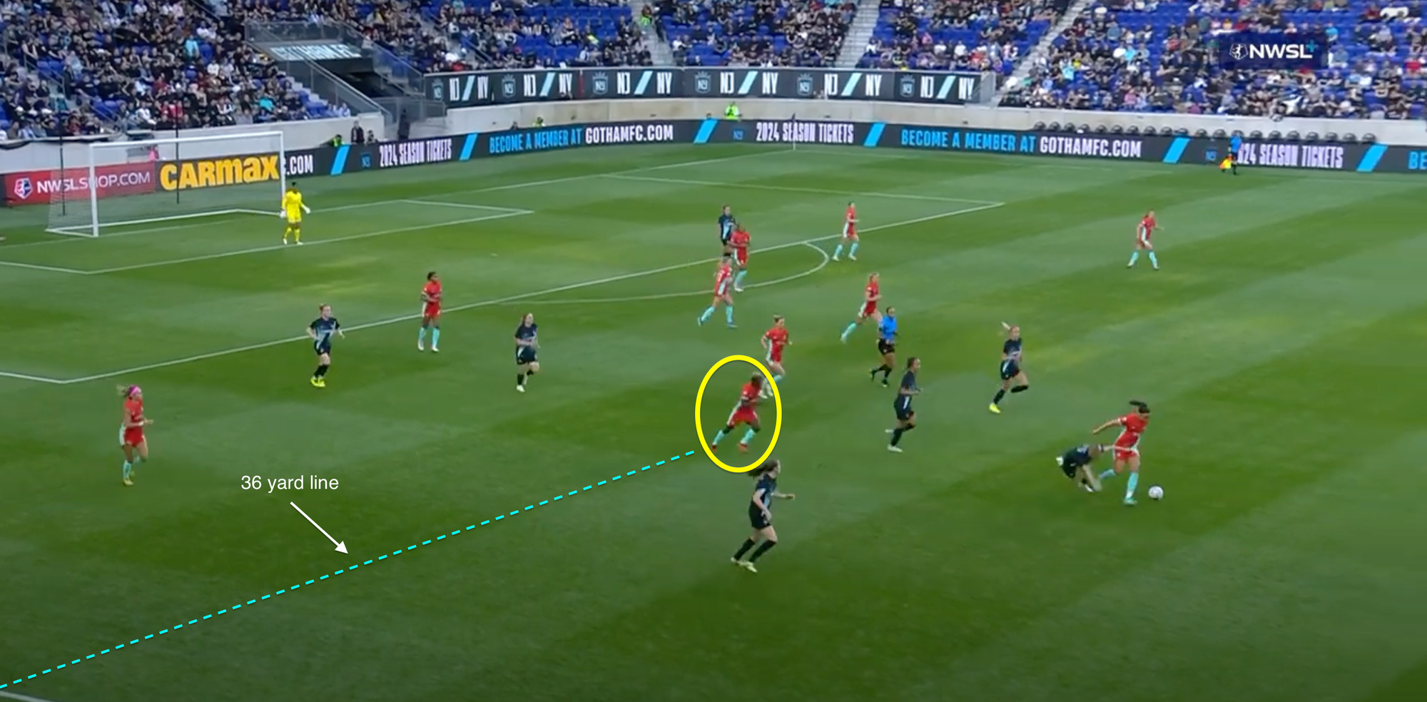 Below is a screenshot of where Bia Zaneratto wins the turnover to ignite the attack. Chawinga starts her counterattacking run on her 36-yard line, at that moment there are seven Gotham players in front of her (including the goalkeeper). Technically eight, if you include Esther Gonzalez who is tumbling to the floor following Zaneratto's tackle.